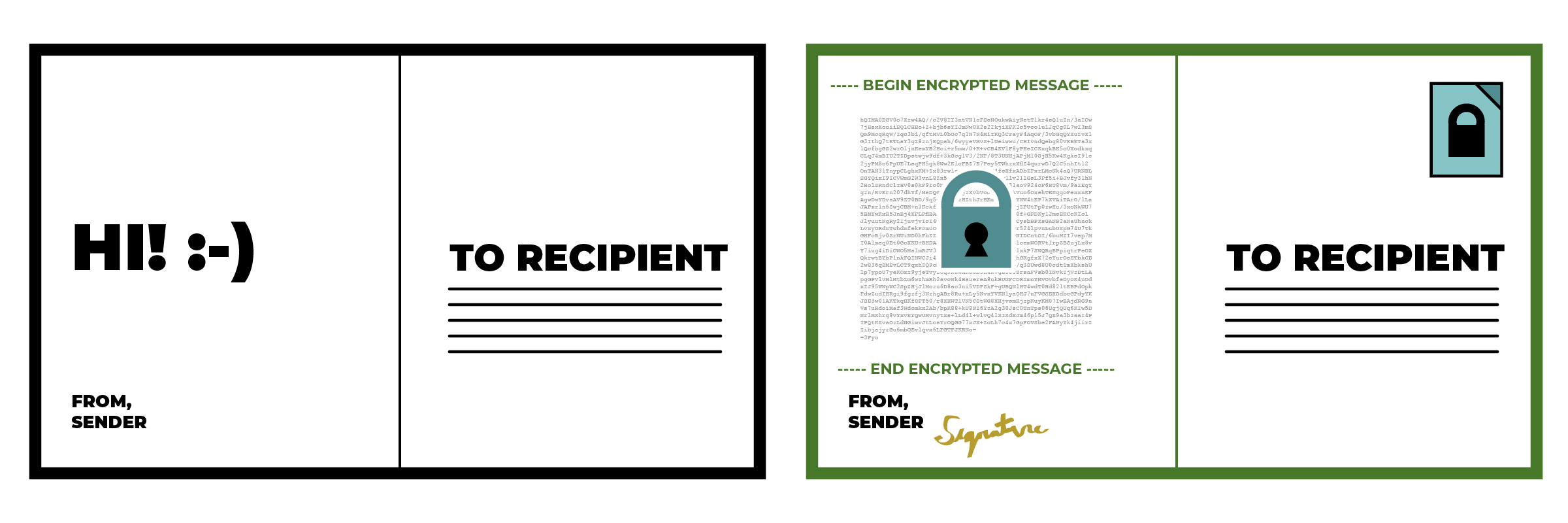 على اليمين، البطاقة البريدية نفسها، والرسالة مُشفّرة بين المُرسِل والمُستقبِل. لا تزال الرسالة تحمل رسالة "مرحبًا! :-)"، لكنها تبدو الآن ككتلٍ من الهراء المُشفّر.