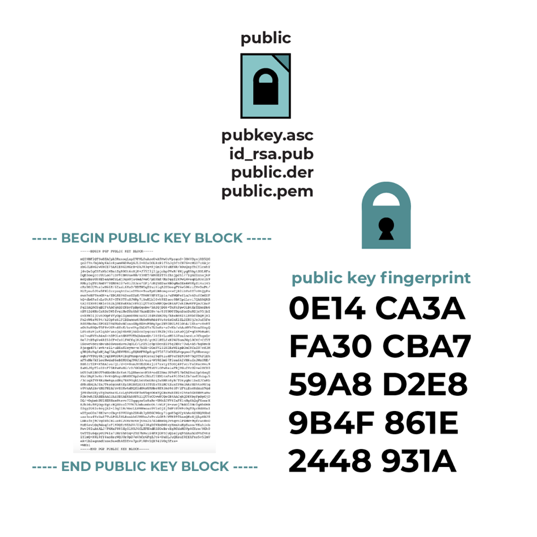المفتاح العام هو كتلة نصية ضخمة في ملف. ويُمثّل أيضًا اختصارًا قابلًا للقراءة يُسمى بصمة المفتاح .