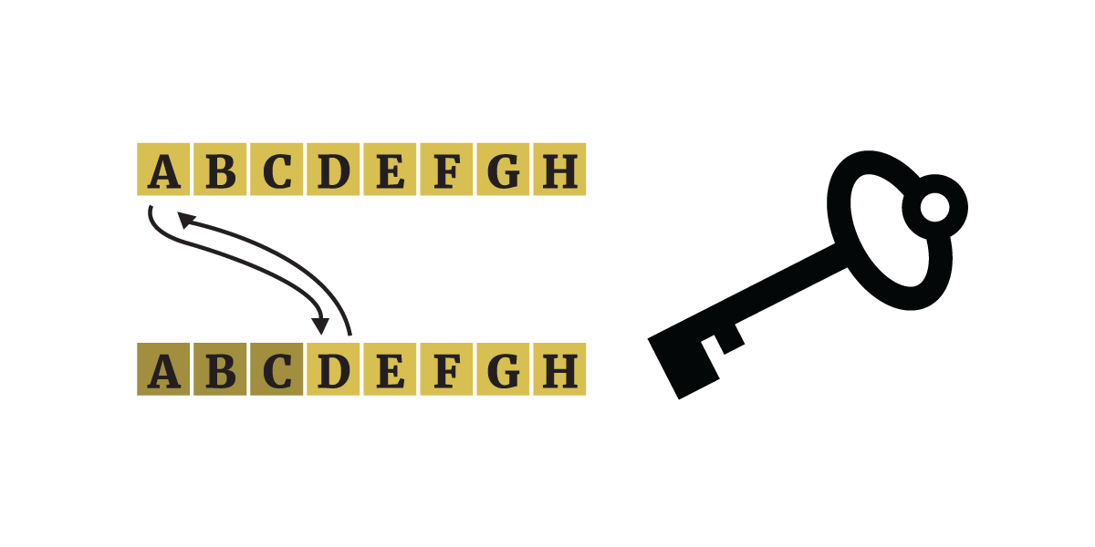كانت أشكال التشفير القديمة متماثلة. في "شيفرة قيصر" التي استخدمها يوليوس قيصر، كان مفتاح تشفير الرسالة وفك تشفيرها إزاحة ثلاثة. على سبيل المثال، يُستبدل الحرف "A" بالحرف "D". باستخدام المفتاح ثلاثة، تُشفّر الرسالة "التشفير رائع" إلى "HQFUBSWLRQ LV FRRO". ويُستخدم هذا المفتاح نفسه لفك تشفيرها وإعادتها إلى الرسالة الأصلية. |