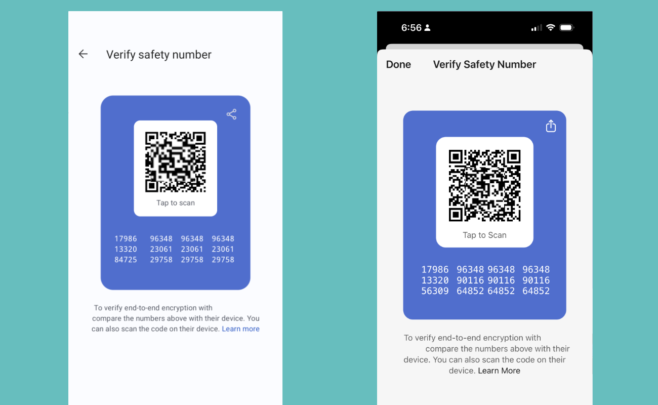 يمكنكما التحقق من تطابق الهوية الرقمية لشخص ما مع هويته من خلال ما يُسمى "التحقق من بصمة الإصبع". لتكوين فكرة عن كيفية عمل ذلك عمليًا، جرّبه/يه في تطبيقي سيغنال وواتساب.