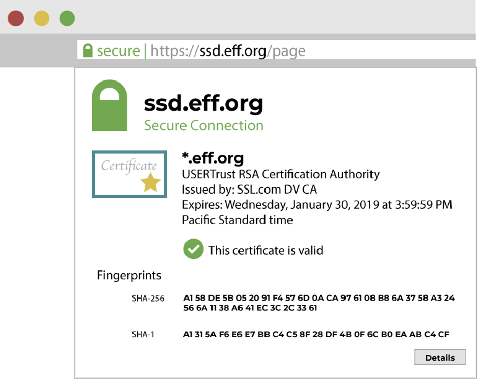 يمكن لمتصفح الانترنت على جهاز الكمبيوتر الخاص بك إنشاء اتصالات مشفرة بالمواقع باستخدام HTTPS. غالبًا ما تستخدم المواقع الالكترونية شهادات الأمان لإثبات لمتصفحك أن لديك اتصالاً آمنًا بالموقع الحقيقي، وليس بنظام آخر يتلاعب باتصالك. تفحص متصفحات الانترنت الشهادات للتحقق من المفاتيح العامة لأسماء النطاقات - (مثل www.duckduckgo.com أو www.wikipedia.org أو ssd.eff.org). تُعد الشهادات إحدى طرق محاولة تحديد ما إذا كنت تعرف/ين المفتاح العام الصحيح لشخص أو الموقع الالكتروني، حتى تتمكن/ين من التواصل معه بأمان.